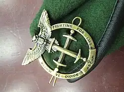 The unit's head badge, also known as "cap badge" or "beret flash", is a single piece of cast brass pinned to the front of the beret. It displays an owl, a nocturnal predator and the symbol of GUR, Ukraine's military intelligence service, despite the battalion not being affiliated to GUR but rather falling under the Ukrainian Armed Forces.[12]