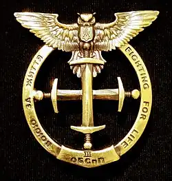 A potential explanation is the unit's focus on reconnaissance, the Ukrainian equivalent of which (розвідка - rozvidka), encompasses both reconnaissance and intelligence.[13] The close association between the two concepts in Ukrainian military doctrine, with GUR's owl as its most prominent symbol, may explain the owl on 3rd Battalion's badge.