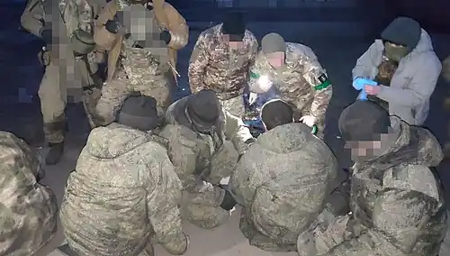 As part of this offensive, the 3rd Battalion brought back 6 Russian prisoners alive, which were later featured in online articles.[16] They can be seen receiving medical treatment by medics from the 92nd Brigade. Two legionnaires from 3rd Battalion are standing behind the Russian prisoners, top left corner. The letters "medic" are visible on the uniform of the man in the center.