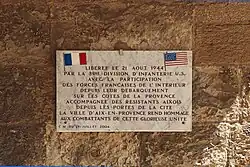 On 15 August 1944, D-Day for Dragoon, the division, still under VI Corps command but now under the U.S. Seventh Army, landed at St. Tropez, advanced up the Rhone Valley, through the Vosges Mountains, and reached the Rhine at Strasbourg, 26–27 November 1944. After maintaining defensive positions it took part in clearing the Colmar Pocket on 23 January, and on 15 March struck against Siegfried Line positions south of Zweibrücken. The division advanced through the defenses and crossed the Rhine, on 26 March 1945; then drove on to take Nuremberg in a fierce battle, capturing the city in block-by-block fighting, 17–20 April. The 3rd pushed on to take Augsburg where it liberated thousands of forced laborers from the Augsburg concentration camp, a forced labor subcamp of Dachau, and Munich, 27–30 April, and was in the vicinity of Salzburg when the war in Europe ended.[18] Elements of the 7th Infantry Regiment serving under the 3rd Infantry Division captured Hitler's retreat near Berchtesgaden.[19]