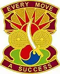 Distinctive Unit Insignia is a gold metal and enamel device measuring 1 3/16 inches (3.02 cm) in height features a scarlet rising sun with eight rays. At the base, on a green field, is a scarlet and blue Korean Taeguk. In the center, two gold locomotive wheels and a white scimitar blade . The brick red scrolls are inscribed "EVERY MOVE A SUCCESS" in gold.[7]