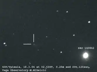 40P/Väisälä is a periodic comet that was discovered on February 8, 1939. Its orbit was determined on April 26, 1939.[2] In 1994, the diameter of its nucleus was found to be 4.2 km (2.6 mi), similar in size to that of Comet Encke.[3]