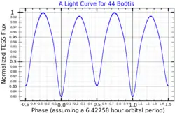 The primary component, 44 Boötis A, also named Quadrans,[17] is a yellow-white G-type main sequence star with a mean apparent magnitude of +4.83. The companion component, 44 Boötis B, is a W Ursae Majoris variable spectroscopic binary. The variability of this star system was discovered by English astronomer William Herschel.[18] The brightness of the eclipsing binary varies from magnitude +5.8 to +6.40 with a period of 6.43 hours.[19] The two eclipsing components of the system are close enough to allow their stellar envelopes to overlap, or at least nearly so.[10] In 1948, flare behavior was measured from this system based on data from O. J. Eggen.[20]