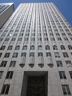 450 Sutter Street, also called the Four Fifty Sutter Building, is a twenty-six-floor, 105-meter (344-foot) skyscraper in San Francisco, California, completed in 1929. The tower is known for its "Neo-Mayan" Art Deco design by architect Timothy L. Pflueger.[4] The building's vertically faceted exterior later influenced Pietro Belluschi in his similarly faceted exterior of 555 California, the former Bank of America Center completed in 1969.[5]