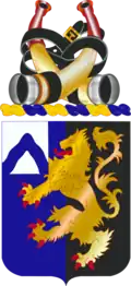 A Gold color metal and enamel device 1+1⁄8 inches (2.9 cm) in height consisting of a shield blazoned: Per pale Azure and Sable a lion rampant Or, on a canton Argent a chevron wavy of the first. Attached below the shield a Gold scroll inscribed "DRAGOONS" in Black letters.