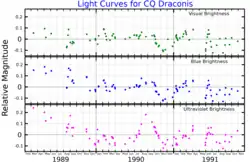 ![]() Light curves for CQ Draconis, adapted from Skopal et al. (1992)[1] The brightening seen (most clearly in the ultraviolet) after June 1990 occurred shortly after the periastron passage.[2] | |