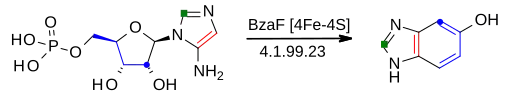 In some anaerobes, AIR is a precursor to 5,6-dimethylbenzimidazole, which is incorporated into vitamin B12 in later steps of cobalamin biosynthesis.[5][18] The initial reaction is catalysed by 5-hydroxybenzimidazole synthase, EC 4.1.99.23, and forms 5-hydroxybenzimidazole: