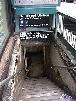 The 50th Street station is a bi-level station on the IND Eighth Avenue and Queens Boulevard Lines of the New York City Subway, located at 50th Street and Eighth Avenue in the Hell's Kitchen neighborhood of Manhattan. The lower level, on the Queens Boulevard Line, is served by the E train at all times, and the upper level, on the Eighth Avenue Line, is served by the C at all times except late nights and the A during late nights.