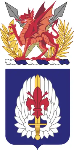 The dragon highlights the unit's motto and commemorates its campaign participation credits earned during World War II; red symbolizes courage and sacrifice. The bamboo spears commemorate Korean War and Vietnam service. The unit's decorations are symbolized by laurel for honor and high achievement and palm for victory.