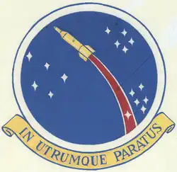 - ^ Approved 25 April 1962. Description: On an Air Force blue disc within a wide white border, fimbriated Air Force blue, an Air Force golden yellow missile in upward flight leaving a red trail arched to sinister base, fimbriated white; all between three groups of white lozenge-shaped stars, five in dexter, five in sinister chief, and six in sinister base (one of these last appearing in the misssile's trail).