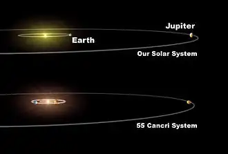 The Solar System with only Earth and Jupiter compared with the planetary system of 55 Cancri (Note: this depiction was made before planets e and f were discovered.)