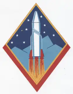 - ^ Approved 20 October 1958. Description: On an Air Force blue lozenge edged Air Force golden yellow and spattered with white stars, a range of light blue mountains issuing from base; overall palewise a white intercontinental ballistic missile shaded light blue speeding upward, its fins red, three rocket motors Air Force blue emitting trails of flame, red, and Air Force golden yellow; encircling the shaft of the missile the light blue SAC ribbon spattered with white stars; outlines and details Air Force blue throughout.