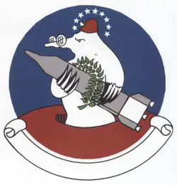 - ^ Approved 2 March 1962. Description: On an Air Force blue disc, a mound of terra-cotta colored earth; emerging from a hole in the mound, a caricatured mole wearing glasses on the end of his long snout, all white, and a miner's cap terra cotta, and supporting in his arms a silver-gray missile, trimmed in white and entwined with a green olive branch; above the mole's head a halo of nine white stars; outlines and details black throughout. Patches exist that indicate that prior to the approval of this emblem, the squadron used the emblem approved for the squadron it replaced at Warren in July 1961, the 549th Strategic Missile Squadron, with the squadron's number substituted for the 549th's.