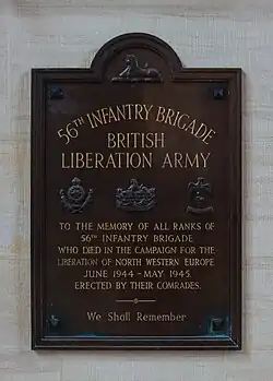 The 56th Brigade took part in the Normandy landings, liberated Bayeux on 7 June leaving the town mainly intact. All its battalions were involved in the taking of Tilly-sur-Seulles with the 2nd Essex finally investing the town. Later actions were north of St Germain d'Ectot and the liberation of Thury-Harcourt in the Suisse Normande. It was prominent in the drive towards Le Havre and the 49th was one of the assault divisions taking the city in Operation Astonia in September 1944. Continuing to fight in Belgium at Poppel and then the Netherlands it was the assault brigade for the final assault on Arnhem in April 1945. The 56th served well, and ended the war in Germany. The division came mainly under command of First Canadian Army throughout the campaign.