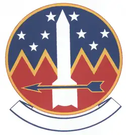 - ^ Approved 19 April 1065. Description: On a blue and red disc divided per fess by a gold dancetty barrulet within a narrow gold border a white missile ascending in pale throughout between in chief eight white stars, two, four and two and surmounted fesswise in base by a blue arrow fimbriated gold. Below a white scroll edged blue. Significance: The blue field depicts the sky... with the eight stars representing the two [Distinguished Unit Citations]s and the six campaign credits awarded the unit in World War II. The arrow refers to early air weapons and the missile to recent air weapons with the red field signifying their propulsion forces. The gold bar alludes to lightning and indicates the mighty power of our weapons systems.