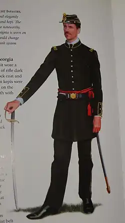 The uniform was also described by the unit commander to the governor of Georgia as follows: "Our Dress uniform is a dress coat of dark green broad cloth, with gilt rifle buttons, and trimmed with gold lace and cord on the outside seams; cap of dark green with letters 'C.R.' surrounded with a gold wreath, light green pompon; wings of brass, army style. Our fatigue dress consists of a dark green cloth jacket, trimmed with gold lace, green cap and black pants."[10]