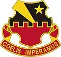 - Symbolism: The insignia is divided horizontally into two parts, the dividing line being embattled to represent defense. The lower half is red for Artillery; the upper half bears the colors of black and gold, significant of the Orient where the unit had its pioneer service. A searchlight beam pierces the darkness of this portion, signifying the never ending vigilance which this organization exercises in searching for enemy aircraft. The star has a double significance. It is symbolic of the state of Texas, the Lone Star State, where the unit was reorganized after World War I, and its battleground in the heavens. The motto translates to "We Rule the Heavens".