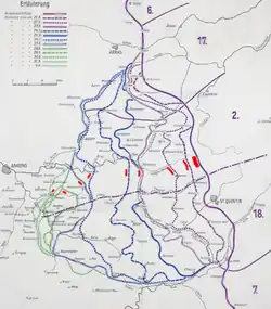 Following its losses, the 66th Division was reduced to cadre early in May; which meant that infantry battalions were cut to ten officers and about 45 men, the surplus being sent to base depots; the artillery, engineer and machine-gun units were distributed among other formations.[54] The divisional artillery was attached to XIX Corps during the Battle of the Avre on 4 April and with XI Corps at the Battle of the Lys later in the month.[55][56] During the summer, Bethell continued planning for the rebuilding of the division, having recruited a staff he felt he could work with, expecting that experienced men would become available as drafts returned from the Mediterranean. Overseas divisions there had suffered fewer casualties and the reduction from four to three battalions per brigade meant that large numbers of men would be returning.[57] While reinforcements were assembled, the divisional cadres of the 66th Division and the 39th Division were used to train five American divisions in the British zone.[58] The training process was complicated by a rigid schedule laid down by the American high command, who strongly objected to any deviation from their plans.[59] In July, the American divisions moved up to the front and British troops began to arrive from Salonika and Palestine, though the assembly of the division was delayed by the returning men being given home leave and having to spend time acclimatising.[60][61]