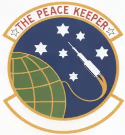 - ^ Approved 31 March 1970. Description: On a blue disc edged with a yellow border issuing from dexter base a green demi-sphere grid-lined yellow from which a white missile is ascending bendwise emitting a yellow arched vapor trail, the missile between six white six-pointed stars. Attached below the disc a blank white scroll edged yellow. Attached above the disc a white scroll edged yellow and inscribed [with the motto] in scarlet letters between two white stars edged black. Significance: The overall theme of the design illustrates the mission of the unit – to maintain the peace through deterrence and, if necessary, launch the force of missiles. The six stars, each with six points, symbolize the 66th Strategic Missile Squadron. The missile crossing the water illustrates the intercontinental nature of the force. The demi-globe is representative of the land mass over which the missiles traverse.