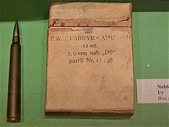 The 7.92×107mm DS was a Polish 7.92 mm anti-tank ammunition designed specifically for use with the karabin przeciwpancerny wz.35 anti-tank rifle. It was based on a standard 7.92×57mm Mauser cartridge, but was much longer (107 mm as opposed to the 57 mm of the Mauser cartridge) and was modified to provide higher muzzle velocity and hence greater penetrating power.
