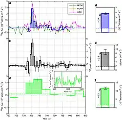 16. ^ a b Mekhaldi; et al. (2015). "Multiradionuclide evidence for the solar origin of the cosmic-ray events of ᴀᴅ 774/5 and 993/4". Nature Communications. 6: 8611. Bibcode:2015NatCo...6.8611M. doi:10.1038/ncomms9611. PMC 4639793. PMID 26497389.