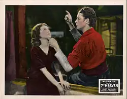 7th Heaven (also known as Seventh Heaven) is a 1927 American synchronized sound romantic drama directed by Frank Borzage, and starring Janet Gaynor and Charles Farrell. While the film has no audible dialog, it was released with a synchronized musical score with sound effects using the Movietone sound system. The film is based upon the 1922 play Seventh Heaven, by Austin Strong and was adapted for the screen by Benjamin Glazer.[3] 7th Heaven was initially released as a standard silent film in May 1927. On September 10, 1927, Fox Film Corporation re-released the film with a synchronized Movietone soundtrack with a musical score and sound effects.