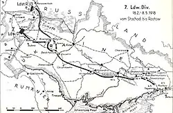 The 7th Landwehr Division (7. Landwehr-Division) was a unit of the Prussian/German Army.[1] The division was formed on January 27, 1915, out of two formerly Mixed Landwehr Brigades (55th and the 57th). The division spent the period from its formation to early 1917 on the Western Front, mainly involved in positional warfare in Upper Alsace, after which it went to the Lorraine front. It was transferred to the Eastern Front in the Spring of 1917, where it remained after the 1917 armistice on that front. In 1918, it served on internal security missions in Ukraine, where it was located when World War I ended. Allied intelligence rated the division as a fourth class division.[2][3] The division was disbanded in 1919, during the demobilization of the German Army after World War I.