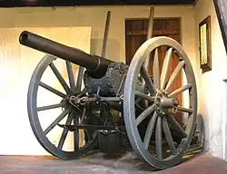 The gun was mounted on an iron carriage with a steel axle, and wooden wheels with iron tires. There were two brackets of sheet iron which converged to the point where the gun was towed. The gun was fixed with its trunnions fitting into two semi-circular openings in the brackets. These were then locked shut with a semi-circular iron clasp. Between the brackets there was a small trail-box. The elevation screw came up from the carriage to a point below the breech of the gun. The screw was operated by a hand-wheel situated on the outer face of the right bracket.[8] The gun carriage did not allow for sideways movement of the barrel. Taking aim was done by shifting the rear of the carriage. To gain leverage, one of the poles sticking upwards on the side of the barrel (see e.g. the photo of the gun in the Waadtländisches Militärmuseum Morges) was placed in an opening at the end of the carriage.