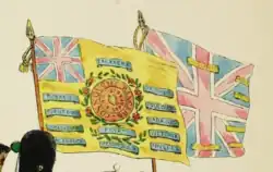 The 1st Battalion then retreated, with the rest of Wellesley's army, to the Lines of Torres Vedras.[15] The battalion, still under the command of Lieutenant-Colonel Wallace made another bayonet charge at the Battle of Fuentes de Oñoro in May 1811 and drove the French Army from the village.[16] It went on to fight at the Siege of Ciudad Rodrigo in January 1812[17] and scaled the walls of the fortress at the Siege of Badajoz in April 1812.[18] At the Battle of Salamanca in July 1812 the battalion was at the centre of the brigade as it advanced and routed the French troops.[19] At Salamanca the battalion captured an old Moorish standard adorned with crescents and bells: the standard, more correctly known as a Turkish crescent, became known in the regiment as the "Jingling Johnny".[20]
