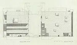 The north and south walls are load-bearing; the walls are all made of reinforced concrete.[5] The party walls, on the building's south and east sides, are massive projecting walls of unadorned and rough reinforced concrete.[8][41] The party walls, visible above the roofs of nearby row houses,[41] are separated and distinct from the more elegant rest of the exterior.[8] The north and west walls originally formed a parapet on the fifth floor, hiding the building's windowed office space from street view while bringing light into the space.[14] Part of the uppermost cantilever on the Madison Avenue elevation can also be seen from the south.[41] The roof is about 97 feet (30 m) high, similar in height to nearby structures.[7]