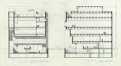 The Whitney began looking for sites for a new museum building in 1958, which would be three times as large as the existing facility.[83] During the 1960s, the Whitney Museum expanded its board of trustees beyond the Whitney family and their close advisors, welcoming new members such as Jacqueline Kennedy, then the First Lady of the United States.[11][84] The new members wanted the Whitney to rival other major museums in the city; the Guggenheim had constructed a new museum in 1959 and MoMA expanded in 1951 and 1964. In the early 1960s, Marcel Breuer and Louis Kahn presented ideas for a new museum building; the two had "captured the committee's imagination" best and thus had been narrowed down from a list of five "radical" architects, none of whom had designed major public buildings in New York City.[26] In 1961, the board selected Breuer,[84] who promised to create a "building designed as sculpture".[28] The new building was to be assertive and experimental, in contrast to the inconspicuous site the Whitney occupied in the shadow of the MoMA.[17] The facility would triple the Whitney's space,[28][16] giving it more room for exhibition halls, an auditorium, a library. and a restaurant.[82][26] Breuer's building would also allow the Whitney to resume acquisitions of pre-1900 art, which the museum had not owned since 1949.[85]