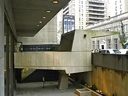 The structure includes a cantilevered facade on the building's western elevation facing Madison Avenue.[2][10] As such, the upper-story galleries protrude farther from the ground-story facade as they rise,[5][14][28] extending outward an additional 14 feet (4.3 m) at each level.[7][29] The cantilevered facade functions as a portico,[30] which Breuer stated would help receive visitors before they enter the museum building.[14] These protrusions led observers to compare the overall massing to an inverted ziggurat.[5][29] The spaces underneath the protrusions are illuminated at night.[31] When the building was finished, Progressive Architecture likened it to the stepped Pyramid of Djoser in Egypt.[14] The southern end of the Madison Avenue elevation has only one cantilever, near the top of the facade, which is not as deep as the cantilevers elsewhere on the facade.[30] The architectural historian Robert McCarter wrote that the interior layout was most heavily influenced by the differing west–east widths of each gallery floor, rather than by the museum's overall floor plan.[32][33]
