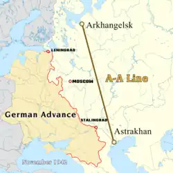 The Arkhangelsk–Astrakhan line,[nb 1][nb 2] or A–A line for short, was the military goal of Operation Barbarossa. It is also known as the Volga–Arkhangelsk line,[1] as well as (more rarely) the Volga–Arkhangelsk–Astrakhan line.[nb 3][2] It was first mentioned on 18 December 1940 in Führer Directive 21 (Fall Barbarossa) which enunciated the set goals and conditions of the German invasion of the Soviet Union, describing the attainment of the "general line Volga–Archangelsk" as its overall military objective.[3]