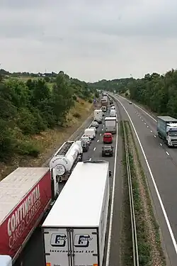 Junction 55 (Copdock interchange) to the south of Ipswich was equipped with signalisation in 2011, along with lengthening the off-slip from the A1214.[18][19] The section around Kettering between Junctions 7 and 9 was widened to three lanes between November 2013 and April 2015 at a cost of £42 million.[20]