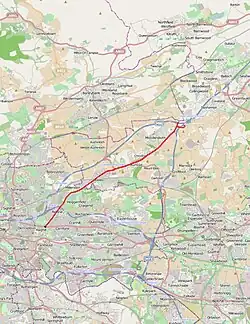 Despite long-term plans to replace the Stepps-Haggs section with a completed M80, the troublesome Auchenkilns roundabout in Cumbernauld was replaced by a grade separated junction in 2005 as traffic congestion meant it could not wait for the final upgrade (which at that stage, was still in planning). A dumbbell interchange junction between the A80, A73 and B8048 was opened in November 2005.[1][2] A scheme was devised in the 1970s to replace the A80 with a motorway which would have linked western segment of the M80, bypassing Cumbernauld and linking to the M8, to the eastern segment, where it connects to the A803 and M876, through what was known as the Kelvin Valley Route. However, this was not implemented.[3]