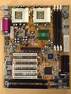 The ABIT BP6 is an ATX motherboard released by ABIT in 1999. It was the first motherboard to allow the use of two unmodified Intel Celeron processors in dual symmetric multiprocessing (SMP) configuration. This combined with its overclocking capabilities made it a popular option among computer enthusiasts.[2] The BP6 has been credited as the product that made multi-processor systems affordable for mainstream users,[3] because prior to its release the expense of any multi-processor configuration made it a feature only to be considered for workstation-class systems.