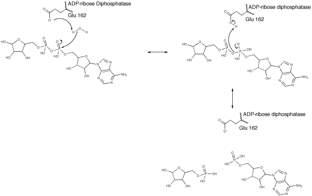 The hydrolysis of ADPR is catalyzed by E162, which improves the nucleophilicity of the water molecule in the active site by deprotonating it. This water is held perfectly in line with the scissile bond by the first and second magnesium ions. The hydroxide ion then attacks the phosphorus atom on the adenosyl phosphate, creating a trigonal bypyramidal intermediate with a negatively charged oxygen attached to the adenosyl phosphate. The double bond is then reformed, effectively discharging ribose 5-phosphate as a leaving group. The third Mg2+ is used to stabilize the negative charge on the leaving group.[4]