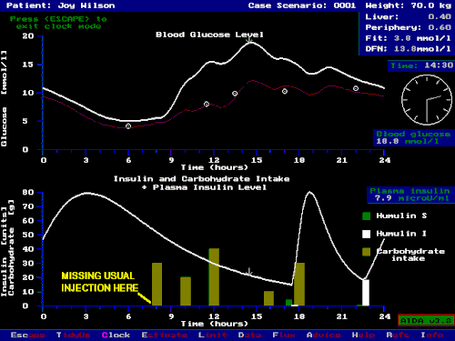 It is important to note that AIDA, like other model-based approaches, is not sufficiently accurate to be used for individual patient simulation or glycemic prediction.[11][12] Therefore, as the program makes clear, it is not intended for insulin therapy planning and can only be used for teaching, self-learning, demonstration, or research purposes. While the AIDA software can simulate a wide variety of insulin dosage and diet (nutrition) adjustments, it should be stressed that the purpose of AIDA is to create a learning environment for communicating and training intuitive thinking when dealing with such adjustments. In this respect AIDA appears most of use for recreating clinical situations in diabetes care — rather than trying to predict best outcome.