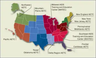The AIDS Education and Training Centers (AETC) are a United States network of five national centers, 11 regional training centers, and over 130 associated local performance sites that provide education on HIV and related co-morbidities such as hepatitis, tuberculosis, and sexually transmitted diseases for healthcare providers in the United States. The AETCs were established in 1987 through federal funding from the Health Resources and Services Administration (HRSA) Bureau of Health Professions. In 1997, the AETCs became a component of the Ryan White HIV/AIDS Program.[1]