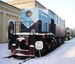 The Soviet-built TE1 (ТЭ1), initially designed TE1-20, was a reverse engineered copy of the Alco product, adapted to metric system and Soviet norms.[3] They were almost identical, but locomotives after #TE1-20-122 had 1050 mm (41.34 inch), instead of 40 inch wheels (1016 mm).[3] The designation meant T - teplovoz (diesel engine), E - electric transmission, model 1, 20 ton axle load.[3] A production lasted from 1947 until 1950 and 300 were made (including 2 of TE5 class).[3] The TE2 (ТЭ2) utilized engine and electric components of TE1, but was as a twin-unit version, with a wagon-type body and utilized two-axle bogies.[4] The TE5 (ТЭ5) was a cold climate version of the TE1. The cab was extended for most of the locomotive to provide covered access to the engine and a boiler was added to keep the cab warm when the engine was not running.[5] Only two (or five) TE5 were built, within TE1 series.[3]