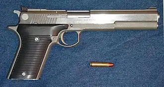 The AMT Automag III is a single action semi-automatic pistol made by Arcadia Machine and Tool (AMT). It was created by Harry Sanford, inventor of the original .44 AutoMag pistol. The Automag III was principally chambered for the .30 Carbine cartridge, which was originally designed for the World War II-era M1 Carbine. It was also one of the few pistols available in the 9mm Winchester Magnum cartridge, but only the original AMT production pistols were made in this chambering, however; later Galena production was limited to .30 Carbine models.[3] The pistol is made of stainless steel and has an 8-round magazine.[4]