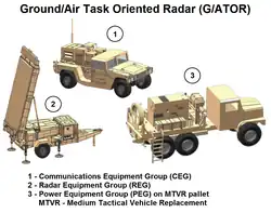 The Ground/Air Task Oriented Radar (G/ATOR) is a single material solution for the mobile Multi-Role Radar System and Ground Weapons Locating Radar (GWLR) requirements. It is a three-dimensional, medium/long-range multi-role radar designed to detect unmanned aerial systems, cruise missiles, air-breathing targets, rockets, artillery, and mortars. G/ATOR is designed to fulfil expeditionary needs across the Marine Air-Ground Task Force spectrum, replacing five legacy radar systems with a single solution.[2]