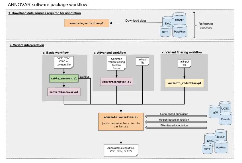 variant annotator | The core script, which functionally annotates the genetic variants via (1) gene-based, (2) region-based, and/or (3) filter-based annotation. | .avinput | .avinput | Data sources are downloaded for annotation, e.g. hg38, UCSC, 1000 Genomes Project. |