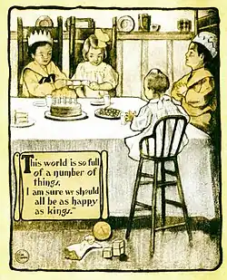 A Child's Garden of Verses is an 1885 volume of 64 poems for children by the Scottish author Robert Louis Stevenson. It has been reprinted many times, often in illustrated versions, and is considered to be one of the most influential children's works of the 19th century.[2] The poems, which have been widely imitated, are written from the point of view of a child. Stevenson dedicated the collection to his childhood nurse, Alison Cunningham.[2]