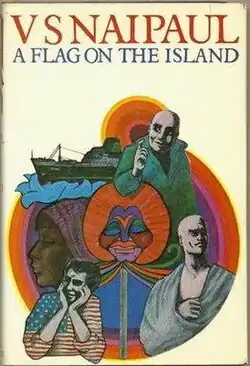 In late 1964 Naipaul was asked to write an original script for an American film.[1] He spent the next few months in Trinidad and Tobago writing a novella, "A Flag on the Island". The finished version was not to the director's liking and the film was never made.[1] The novella is set in 1964 in a Caribbean island that is not named.[2] The main character is an American named "Frankie" who affects the mannerisms of Frank Sinatra.[1] Frankie has links to the island from having served there during World War II.[3] He revisits reluctantly when his ship anchors there during a hurricane.[3] Naipaul wilfully makes the pace of the book feverish, the narrative haphazard, the characters loud, the protagonist fickle or deceptive, and the dialogue confusing.[3][1] Balancing the present time is Frankie's less disordered, though comfortless, memory of 20 years before.[4] Then he had become a part of a community on the island.[4] He had tried to help his poor friends by giving away the ample U.S. Army supplies he had.[4] Not everyone was happy about receiving help and not everyone benefited.[4] Frankie was left chastened about finding tidy solutions to the island's social problems.[4] This theme, indirectly developed in the story, is one to which Naipaul would return.