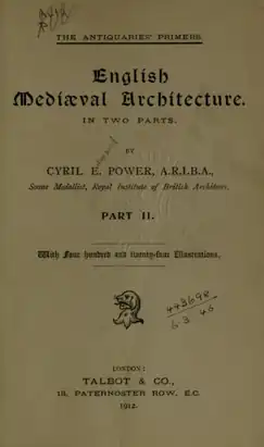 English mediæval architecture is a book published in three volumes in 1912, re-published in two volumes in 1921 and one volume in 1931, by architect and artist Cyril Edward Power. It features 424 of his drawings and illustrations and was published by Talbot Press.