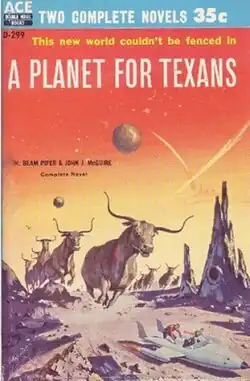 A Planet for Texans (also published as Lone Star Planet) is a science-fiction novel written by Henry Beam Piper and John Joseph McGuire. It was first published in the March 1957 issue of Fantastic Universe as Lone Star Planet and first published in book form in Ace Double D-299 in 1958. The story originated in a suggestion by H. L. Mencken[1] and presents a world on which the assassination of politicians is accepted practice. It eventually won a Prometheus Hall of Fame Award in 1999.