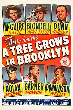 A Tree Grows in Brooklyn is a 1945 American drama film that marked the debut of Elia Kazan as a dramatic film director. Adapted by Tess Slesinger and Frank Davis from the 1943 novel by Betty Smith, the film focuses on an impoverished but aspirational, second-generation Irish-American family living in the Williamsburg neighborhood of Brooklyn, New York, in the early 20th century. Peggy Ann Garner received the Academy Juvenile Award for her performance as Francie Nolan, the adolescent girl at the center of the coming-of-age story. Other stars are Dorothy McGuire, Joan Blondell, Lloyd Nolan, Ted Donaldson, and James Dunn, who received the Academy Award for Best Supporting Actor for his portrayal of Francie's father.