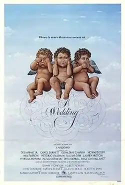 A Wedding is a 1978 American satirical comedy-drama film directed by Robert Altman, with an ensemble cast that includes Desi Arnaz, Jr., Carol Burnett, Paul Dooley, Vittorio Gassman, Mia Farrow, Lillian Gish, Geraldine Chaplin, Howard Duff, Nina Van Pallandt, Amy Stryker, and Pat McCormick.[3] The story is told in typical Altman style, with multiple plots and overlapping humorous dialogue.