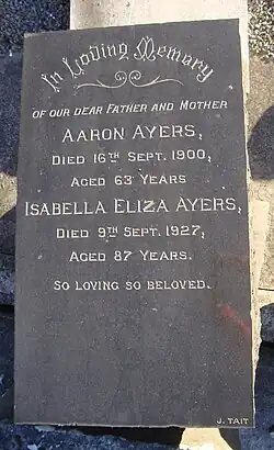 After suffering from failing health for some time, Ayers died on 16 September 1900 at his home in River Road in Avonside.[28][29] He was buried at Linwood Cemetery.[30] He was survived by his wife and eight of their children.[27] His wife died on 9 September 1927 and was buried with her husband.[31]